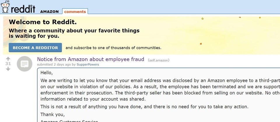 華爾街時報引述Amazon說法報導, 經過調查Amazon已經找到並開除洩露公司資料的員工。這家電商龍頭周五已通知部份顧客他們的電子郵件被洩露給了Amazon平台上的賣家。但除了電子郵件外,沒有其他資料外洩。