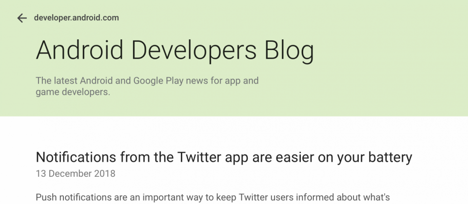 推特認為,電池壽命屬於行動用戶體驗重要的一部分,因此一直以來,他們盡力的降低應用程式對使用者手機電池電力的影響,而在推送通知功能上也做出了改變。在今年推特將通知訊息函式庫從Google雲端推送(GCM)遷移到了Firebase雲端推送(FCM),由於FCM提供更多的功能,讓推特可以掌握電力資訊,也可以使用getPriority()以及getOriginalPriority()這類API,監控FCM的訊息優先度是否遭到系統降級。