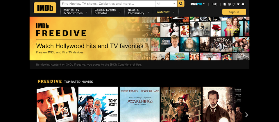 Amazon最近在旗下的影音平臺IMDb推出免費串流服務Freedive,提供美國地區的用戶免費的電視劇、好萊塢電影,用戶透過IMDb或是Amazon的帳戶登入後,就能免費觀看Freedive的內容,不需要訂閱,且能透過Amazon Fire TV設備、個人手機、筆電或是更大的螢幕上觀看。IMDb平臺收錄多種類型影片,包含熱門電視節目、預告片、名人訪談節目,還有IMDb原創的短片系列,不過這些免費的影片是透過廣告商贊助收益,因此會置入廣告,而且這些廣告不能被跳過。