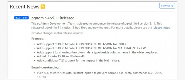 pgAdmin開發團隊發布9.11版,修補重大資安漏洞CVE-2025-13780,可能導致遠端程式碼執行,影響pgAdmin在伺服器模式下執行資料庫還原作業的安全性