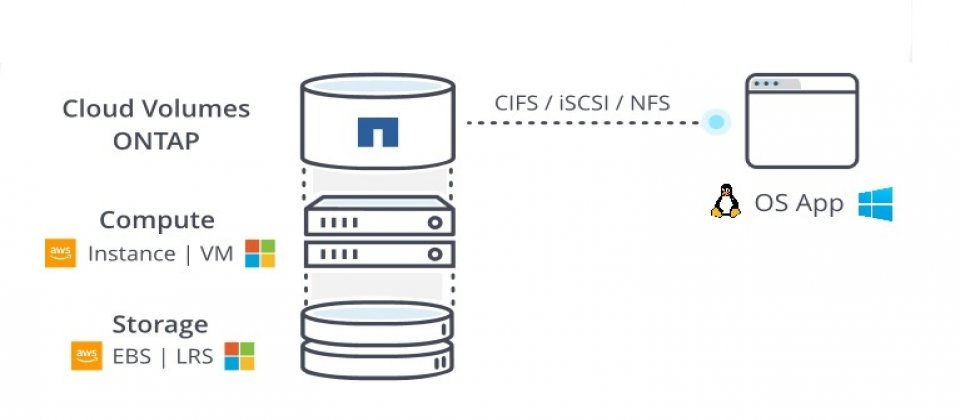 NetApp Cloud Volumes屬於典型的原生部署架構,直接利用AWS的執行個體或Azure的VM來運行ONTAP儲存系統,扮演儲存控制器角色,並掛載AWS的EBS或Azure的LRS儲存空間,作為儲存服務的空間。