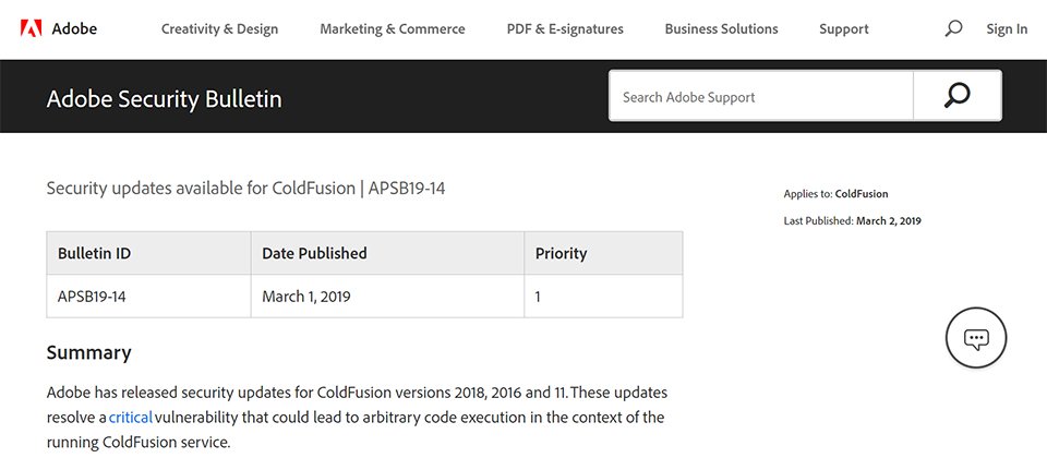 Adobe於3月1日緊急修補已遭駭客開採的ColdFusion安全漏洞,ColdFusion為一商用的快速網路應用程式開發平台,此一編號為CVE-2019-7816的安全漏洞將允許駭客執行任意程式,被列為重大(Critical)等級,Adobe呼籲用戶應儘快修補。