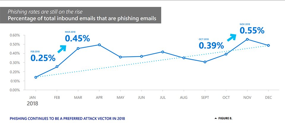 微軟在2018年的《安全情報報告》(Microsoft Security Intelligence Report)中指出,網路釣魚依舊是駭客執行攻擊的首選之一,從去年1月到11月間,內含網釣訊息的電子郵件比例增加了250%。