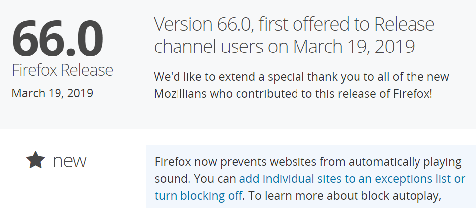 Firefox 66最大的改進是加入Block Autoplay的功能,防止網頁自動播放有聲影片。Block Autoplay可以偵測網頁中自動播放出有聲音的影片,並使之暫停播放,使用者如果想看影片,必須按下播放鍵。但如果網頁自動播放的是無聲音的影片,這項功能就不會啟動。使用者可在此下載最新版Firefox。