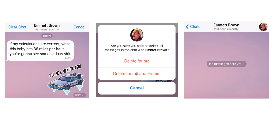而今Telegram把該功能擴大為「取消任何訊息的發送」(Unsend Anything),先是移除了48小時的限制,代表不管多久的歷史訊息都可被消滅,再者此一強大的取消發送功能還能取消對方所發送的訊息,而且可同時取消雙方裝置上的訊息。