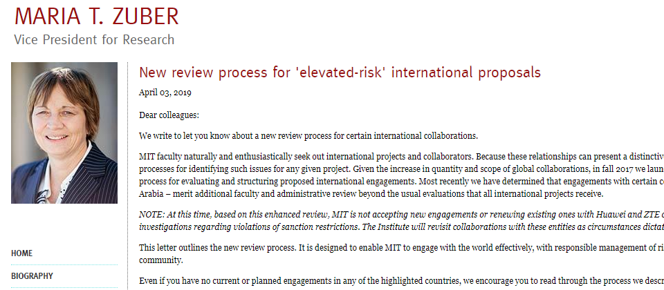 MIT研究副總裁Maria Zuber對內部職員發佈公開信說明該校做出的新決定。她說,MIT常有很多國際合作機會,由於這些合作可能帶來風險或問題,因此MIT向來對可能的合作專案有繁複的評核流程。但因為國際合作的量與範疇近年愈來愈大,MIT於是在2017年秋天啟動強化評估流程。近期MIT公佈新的審核流程,並決定三類專案需要比一般國際合作專案接受更嚴格的審核。