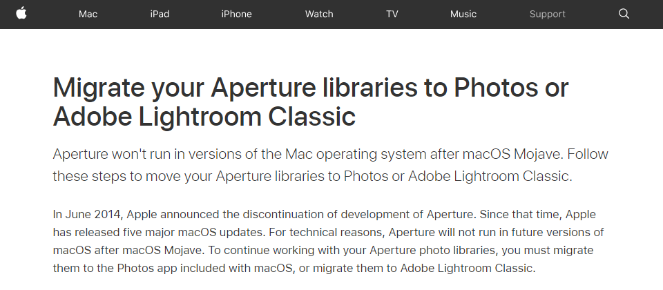蘋果最近在技術支援文件中公布,於2005年推出的照片編輯軟體Aperture將不再支援macOS 10.14(macOS Mojave)以後的macOS作業系統,並鼓勵使用者將Aperture圖庫遷移到macOS內建的Photos或Adobe的Lightroom Classic。