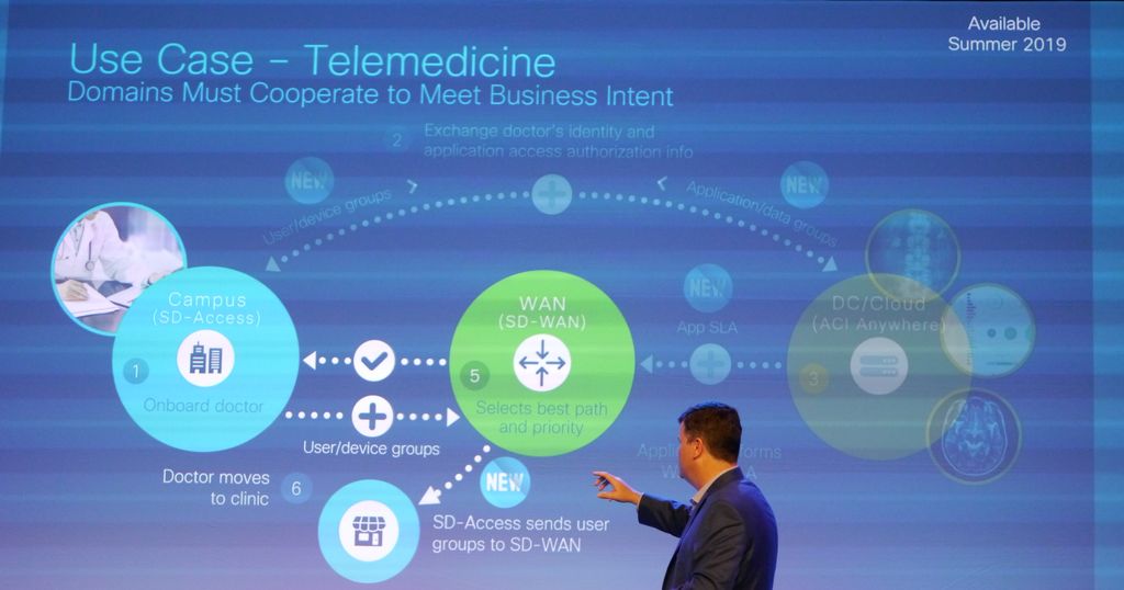 這個架構實際上該如何應用?思科企業網路業務資深副總裁暨總經理Scott Harrell以遠端醫療為例,讓在園區網路上線的醫師身分、裝置的群組資訊,與位於資料中心或雲端服務的應用程式與資料群組,進行交換的程序,並且驗證其身分與應用程式存取授權,接著,醫師就會被批准而能存取這邊的醫療影像,再將應用程式的服務等級協定傳送到廣域網路管理系統,提供最適合的網路連接路徑與優先處理順序,並以此連結園區網路,將醫師的身分與裝置群組資訊傳至廣域網路系統的分支機構裝置,醫師就能開始進行診療的工作。