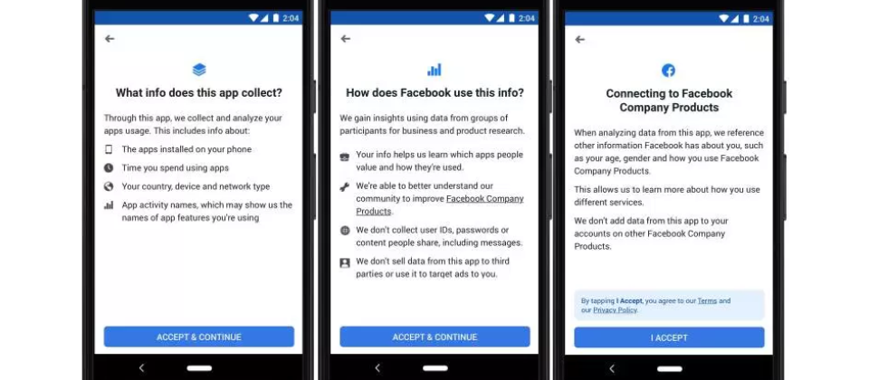 看來Study from Facebook已經解決了之前Facebook Research VPN所惹出的爭議,包括Facebook Research VPN是透過蘋果專門替企業內部使用所打造的Enterprise Developer Certificate來發行,違反了蘋果的政策,或者是它徵求未成年人的參與,再加上它不僅可紀錄手機上的程式,還能解密流量,甚至要求使用者拍下Amazon訂單紀錄並回傳。