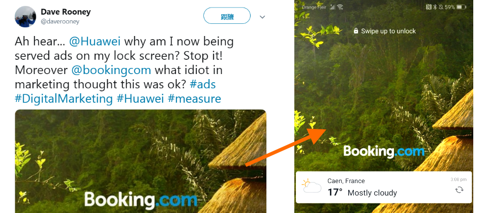 一名用戶在推特抱怨,他的華為手機鎖定螢幕上無預警出現來自Booking.com的廣告。(圖片翻攝自https://twitter.com/daverooney/status/1139165324992045061)