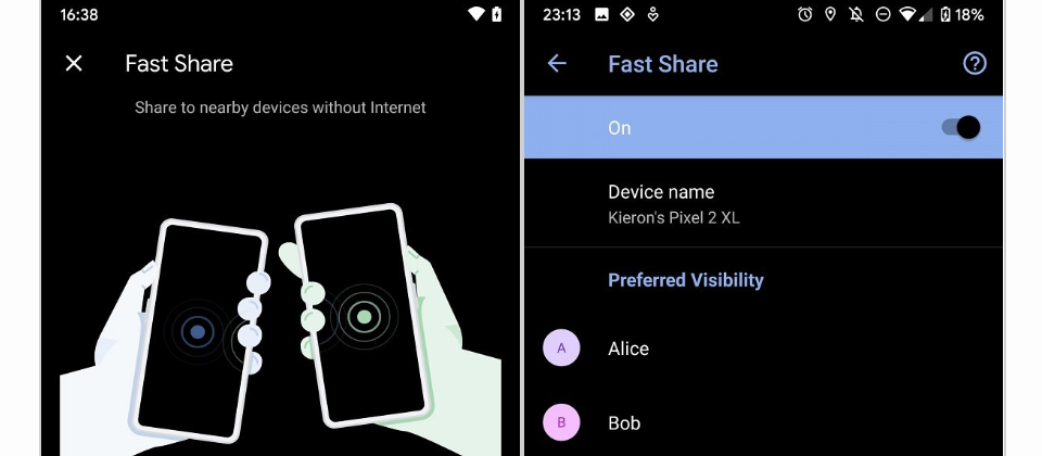 取而代之的功能名為Fast Share,它出現在Android Q的「設定」、「Google」類別下,功能和介面都和獨立app Files Go By Google相似,可讓用戶傳送檔案、URL或文字給鄰近用戶。