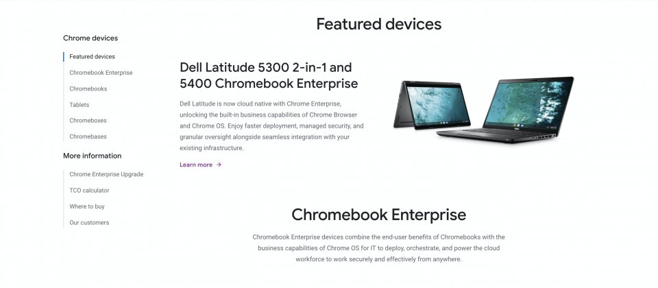 Chromebook Enterprise有兩個型號,其一為型號Latitude 5400的14吋傳統翻蓋式Chromebook ,電池可持續20個小時,售價為699美元,而另一款則是型號為Latitude 5300的二合一Chromebook,使用可拆卸的13吋顯示螢幕,螢幕可當作平板使用,視配置與用途,電池使用時間約為14個小時。兩者都可以配置英特爾第8代Core i7處理器,最高32GB的記憶體和高達1TB的SSD儲存,同時還有USB Type-C且可選用LTE。