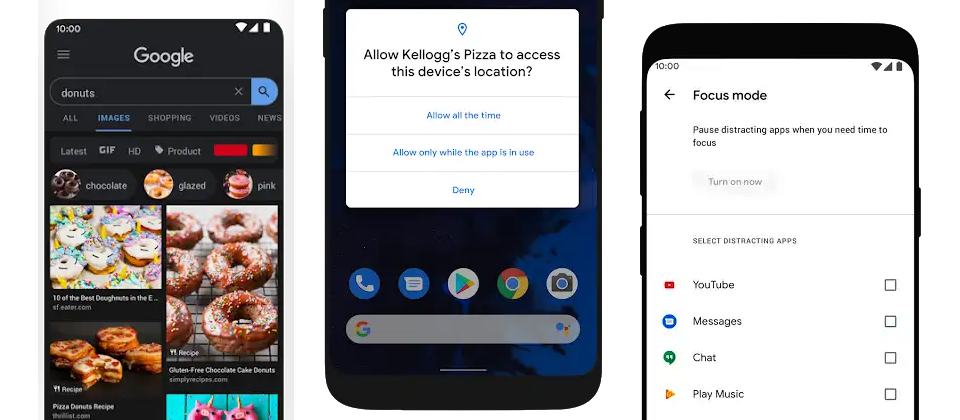 其他功能還包括,為工作或個人生活情境設定不同鍵盤、可為不同網站設定計時器。不受打擾的「靜默」(Silent)設定,讓任何通知不會發出聲音或出現在鎖定螢幕上。新的「專心模式」(Focus mode),可暫停擾人的app如電子郵件或新聞。也延續Android 9的家長控制功能Family Link,允許設定手機或特定app使用時間、或檢閱兒童手機安裝及使用app的情形。
