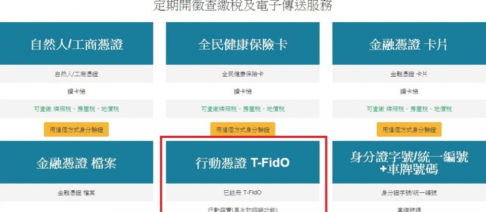目前在財政部的地方稅網路申報作業網站中,地價稅線上查繳稅系統裡,在原本的自然人/工商憑證、健保卡、金融憑證、身分證字號+車牌號碼之外,現在多了T-FidO的身分驗證方式。