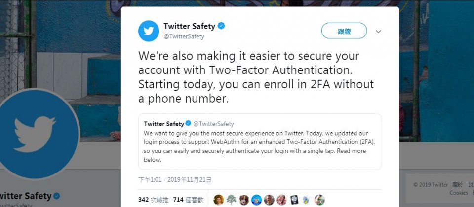 2FA常被用來確保帳號安全,也是啟用推特帳號的必要條件。雖然用戶之後可以改以軟體如Google Authenticator,或以硬體金鑰方案Yubikey等來登入,但是最初申請啟用推持的2FA仍然必須註冊電話號碼。在周四的宣佈中,推特表示已升級推特的登入流程,支援WebAuthn標準使用2FA,未來只要單一點擊即可驗證啟用。
