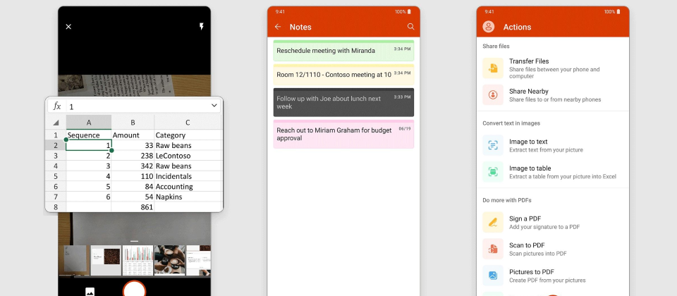 新Office App介面和Word、Excel、PowerPoint一模一樣,讓用戶可在單一環境下開啟和編輯不同文件,也加入一些不錯的功能,像是類似Office Lens可拍照文件或表格後,轉成Word、Excel內容,將檔案分享給鄰近手機或電腦,以及內建QR code掃瞄、便箋(notes)功能。此外還整合OneDrive、支援PDF檔案簽章及掃瞄功能。