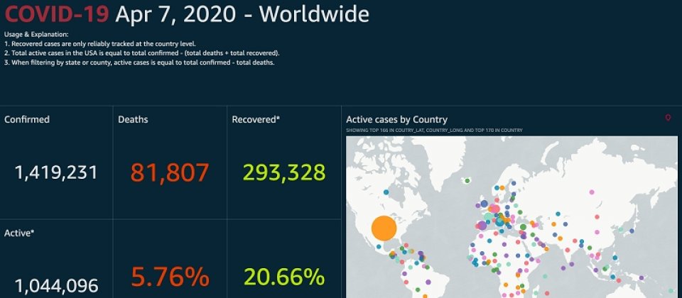 AWS也使用武漢肺炎病例追蹤、測試及病床資料,以Amazon QuickSight建立了公開儀表板,提供疫情每日資料更新,使用者能夠查看各國家和各省的詳細資料。