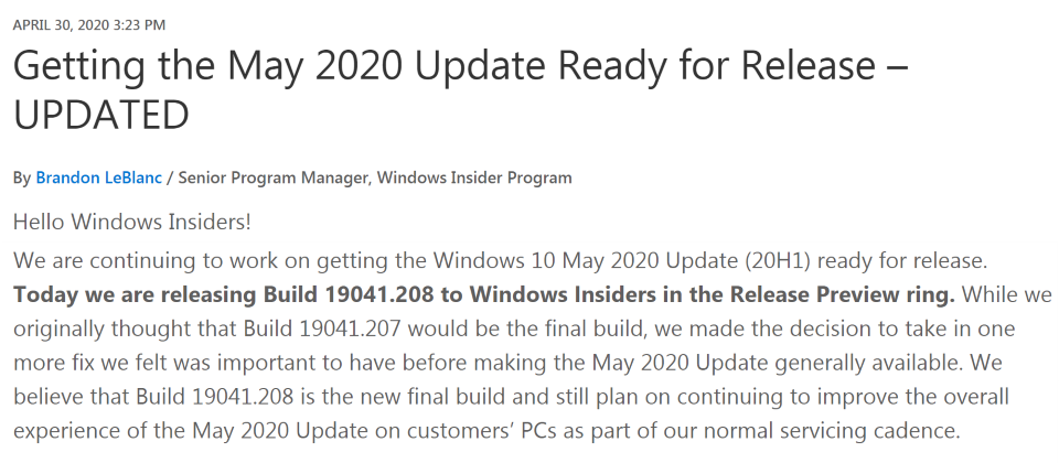 LeBlanc解釋,之所以再追加一版,是因為加入了他們認為很重要的一個修補,微軟相信Build 19041.208應該是May 2020 Update前的最後一個build,雖然他們還計畫在整體使用經驗上持續改進。