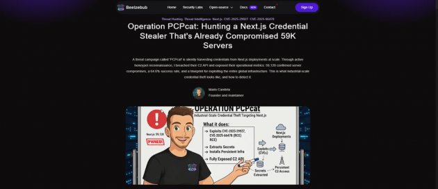 惡意軟體活動Operation PCPcat針對可從網際網路存取的Next.js應用程式而來,試圖透過CVE-2025-55182(React2Shell)入侵,滲透5.9萬臺應用程式伺服器,估計至少偷走30萬組憑證