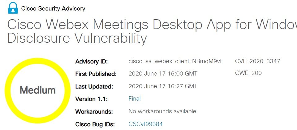 編號CVE-2020-3347的漏洞是由安全廠商TrustWave研究人員Martin Rakhmanov於4月發現,影響WebEx Meetings Windows 桌機版App 40.4.12.8版。