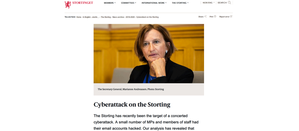 挪威國會於9月1日公告,他們遭遇大規模資安攻擊事件,部分議員及國會員工信箱,被不明人士駭入。挪威國會議長Marianne Andreassen指出,這次事件中,少部分議員及員工郵件遭到存取,導致程度不一的資料被下載。IT部門已經個別通知受影響的人。