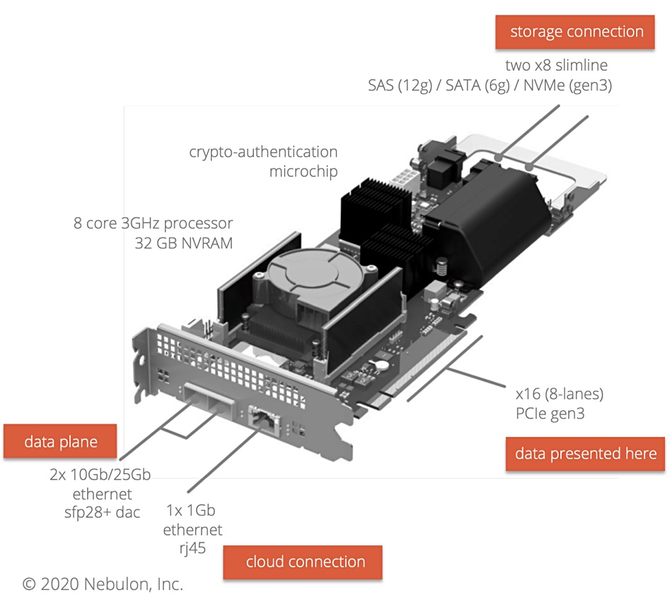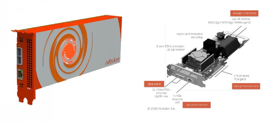Nebulon的訴求,是提供擁有硬體加速功能的虛擬化SAN儲存系統,從而克服過去軟體定義化儲存與外接儲存產品的不足。比起一般完全軟體定義化的虛擬化儲存產品,Nebulon可透過SPU卡來卸載伺服器CPU負荷,降低儲存I/O對CPU效能的衝擊,進而改善整體效能;而比起一般的標準外接式SAN儲存陣列,Nebulon透過安裝在伺服器主機內的SPU卡,來承擔儲存控制器角色,能以更低的成本提供相同的服務。
