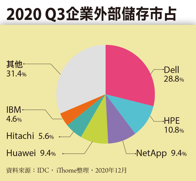 IDC的2020年第3季外部儲存市占追蹤顯示,比起去年同期,企業外部儲存市場的整體銷售額下降了1.8%,即使是這幾年最熱門的全快閃儲存陣列,與去年同期相比的成長率,也只有0.4%。