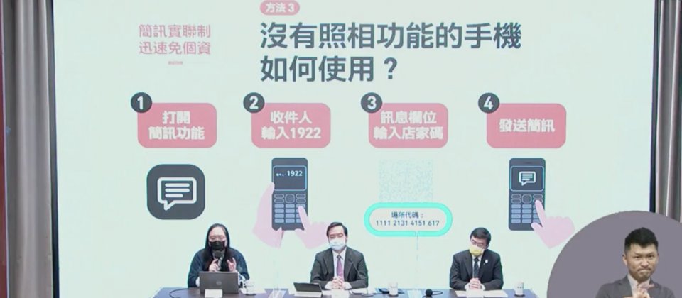 唐鳳表示,簡訊實聯制適用於店家或沒有統編的小攤商,公關機關及公共運輸,簡訊實聯制有幾項特色,發送簡訊不收費,不需加入會員,也不需要特殊的設備才能使用,即使是陽春的手機也能使用,另外,民眾不會在店家留存個資。如民眾不方便使用手機,還是能以紙筆方式留下實聯資料。