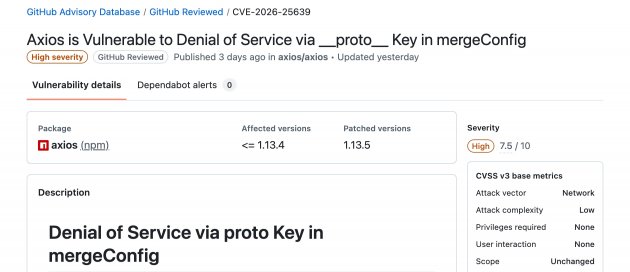 JavaScript HTTP用戶端程式庫Axios曝CVE-2026-25639拒絕服務漏洞,合併請求設定時在特定輸入下會誤觸物件原型相關欄位處理流程,導致程序意外終止並可能讓後端服務中斷