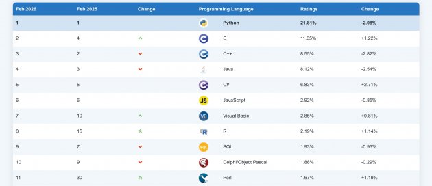 TIOBE指數Python以21.81%續居冠軍,但自2025年7月高點後回落,較去年同月下滑2.08個百分點。TIOBE認為,部分需求轉向特定領域語言,R排名回升至第8,Perl則大幅躍升至第11