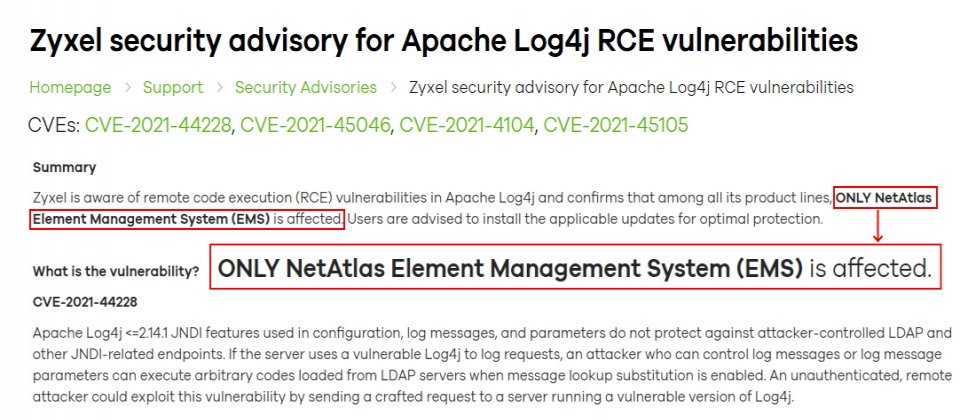 合勤表示得知Apache Log4j的遠端程式碼執行(Remote Code Execution,RCE)漏洞,但該公司調查後,證實所有產品線中僅網管系統NetAtlas Element Management System(EMS)受到影響,包含最危險的CVE-2021-44228,以及CVE-2021-45105,分屬於CVSS 10.0及9.8的遠端程式碼執行(RCE)及阻斷服務(DoS)漏洞。