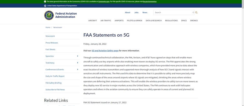 FAA在上週宣佈也宣布一項修正版適航指令(Airworthiness Directive,AD)的改版,他們估計全美有90%的商業航空機隊,在5G服務環境下以低能見度方式操作,而在1月20日,FAA發布聲明指出,他們認為部分無線電高度計太敏感而無法不受到5G訊號干擾,為了確保安全性,配備這些無線電高度計的飛機會禁止以低能見度的方式降落至5G部署的機場,因為這些設備無法提供精確資訊。