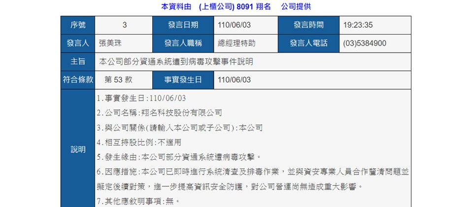 臺灣上市櫃公司遭病毒攻擊事件不斷,繼5月26日威剛揭露遭病毒攻擊事件後,在6月3日又有一家國內公司遇害,上櫃電子零組件業翔名於6月3日在臺灣證券交易所發布重大訊息,公告發生部分資通系統遭到病毒攻擊事件。