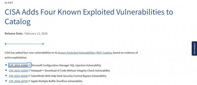 前身為SCCM的Microsoft Configuration Manager於2024年修補的9.8分重大漏洞,被偵測到發生攻擊行動,美國網路安全暨基礎設施管理署(CISA)2月12日將其列入已知受濫用漏洞清單