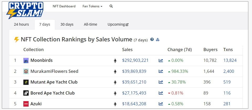 知名NFT播客Proof在4月16日推出了NFT專案Moonbirds,該專案創造了1萬個特徵不一的貓頭鷹頭像(Picture for Profile,PFP),發行價為2.5個以太幣(約7,600美元),但短短的3天內,它在OpenSea上二級市場的價格就飆漲到14個以太幣以上,交易規模接近3億美元,躍上這幾日的NFT交易冠軍寶座。