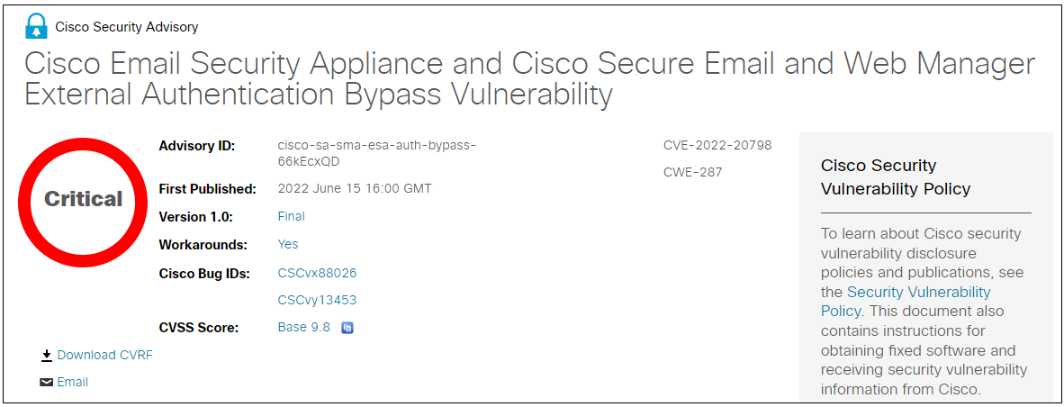 思科(Cisco)15日督促用戶修補一個位於Cisco ESA及Cisco Secure Email and Web Manager裝置的安全漏洞,此一編號為CVE-2022-20798的漏洞將允許駭客繞過外部的身分認證,其CVSS風險評分高達9.8。