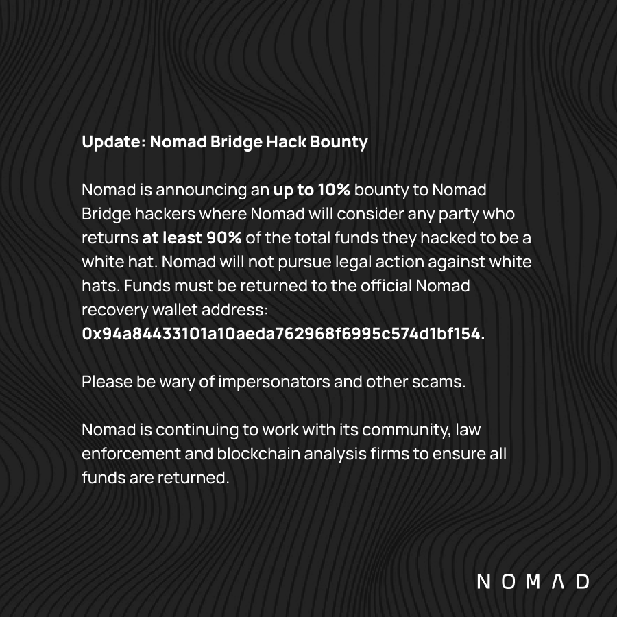 此外,為了鼓勵駭客們歸還款項,Nomad也宣布會把任何歸還至少9成資產的駭客當作白帽駭客,允許他們保留10%作為獎勵,而且不予追究,並強調Nomad正與加密貨幣社群、執法機關及區塊鏈分析業者合作,以確保所有的款項都會被歸還。