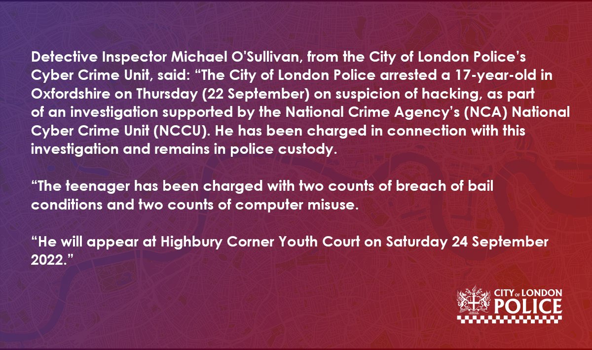 倫敦警方周六說明,該青少年已被以2項違反交保條件及2項電腦不當使用罪名起訴,他也在當天在青年法院受審。