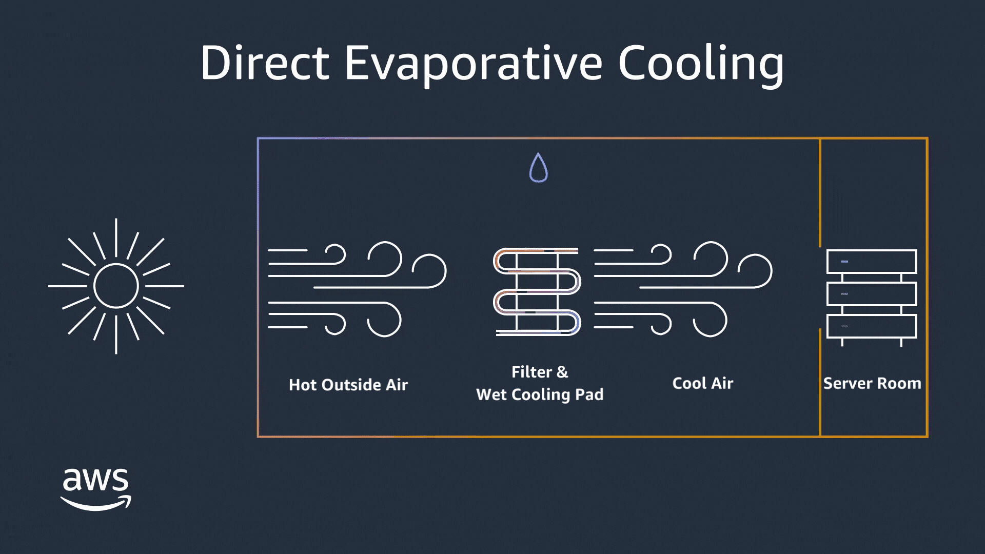 為了減少資料中心對水的需求,AWS打造了高效率的冷卻系統,首選冷卻策略為蒸發技術,讓自外部吸入的熱空氣經過浸水的冷卻墊,再將已冷卻的空氣送進伺服器機房;另也設計了一款自由空氣冷卻系統,部署感應器來追蹤溫度及溼度等氣候參數,一旦條件達到安全工作範圍,蒸發冷卻系統就會關閉,讓來自外部的冷空氣直接輸送到伺服器機房。