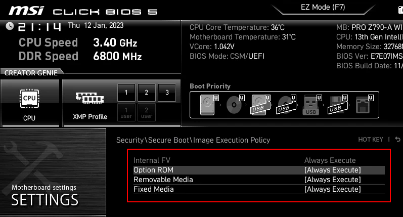研究人員發現微星主機板上的安全開機設定選單中的「映像檔執行政策」,對可移除媒體、固定媒體、Option ROM預設值均為「永遠執行」,意謂著預設情況下,韌體不會對程式進行任何驗證。他說這項政策只是為了滿足Windows 11對PC 硬體的要求,但預設不驗證,Windows就不知道安全開機功能不起作用。