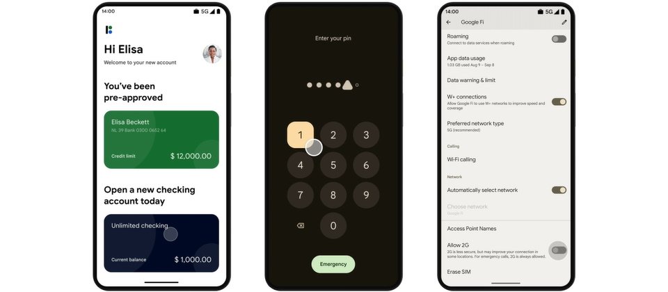在Android 14中提供新的憑證管理員控制工具(圖左),用戶能設定6個數字的個人識別碼(PIN)(圖中),也可根據風險等級來關閉2G網路的連結(圖右)。圖片來源/Google