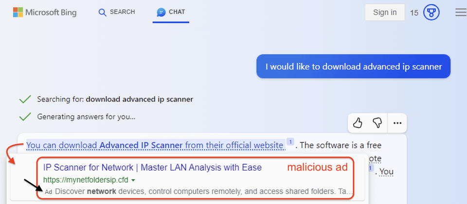 資安業者Malwarebytes揭露濫用人工智慧搜尋引擎Bing Chat的攻擊行動,他們詢問該聊天機器人如何下載網路掃描程式Advanced IP Scanner,結果第一個搜尋結果就是駭客的惡意廣告。