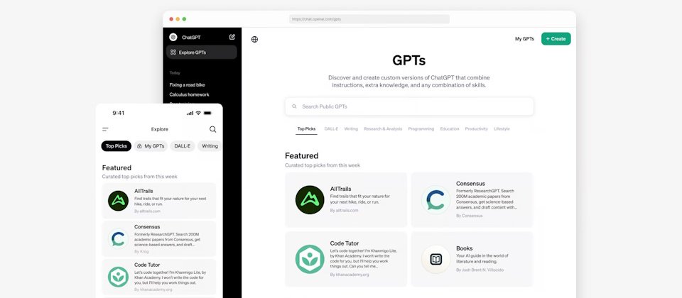 GPT Store上列出GPTs主打(Top picks),另有DALL-E、寫作、生產力、研究&分析、程式撰寫、教學及Lifestyle等類別,並提供搜尋工具方便用戶自行搜尋。主打區列出最有用或受歡迎的GPTs。首批清單包括可汗學院的Code Tutor、2億學術報告搜尋及合成助理Consensus、個人化登山路徑建議AllTrails、簡報或社群網站貼文設計助理Canva、書本推薦專家Books,和數學及科學AI家教CK12- Flexi。