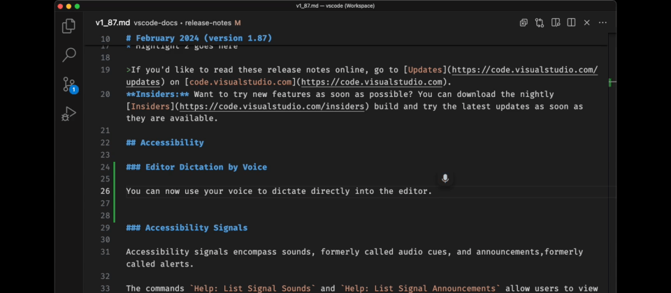 VS Code開始支援語音輸入功能,開發者需要先安裝VS Code Speech擴充套件,使用快捷鍵啟動和停止編輯器的語音輸入,而用戶也可以選用對講機模式,按住快捷鍵啟用語音辨識,並在釋放按鍵時停止語音辨識。語音輸入功能也適用於編輯器其他功能,像是SCM提交輸入框,還有審查拉取請求時的評語輸入欄位等。