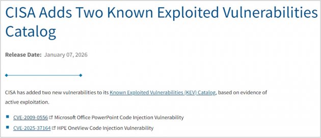 美國網路安全暨基礎設施安全管理署(CISA)將微軟2009年修補的PowerPoint漏洞,以及HPE去年12月修補的基礎架構管理軟體OneView漏洞,列入已知濫用名單