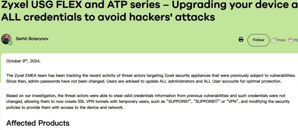 針對受這波攻擊影響的範圍,該公司指出涵蓋執行ZLD V4.32至5.38版韌體的防火牆,而且啟用遠端管理或SSL VPN的功能。此外,這些遭到攻擊的防火牆,管理員及使用者的帳密資料,過往未曾進行更新。但他們強調,執行Nebula雲端管理模式的防火牆不受影響。