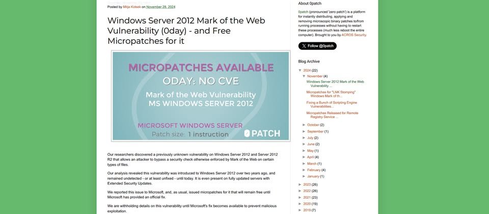 11月28日專門提供微修補的資安業者0patch指出,他們在伺服器作業系統Windows Server 2012、2012 R2發現零時差漏洞,一旦遭到利用,電腦對於來自網際網路的特定類型檔案,執行Mark of Web(MotW)安全檢查的流程,就有可能被攻擊者繞過。