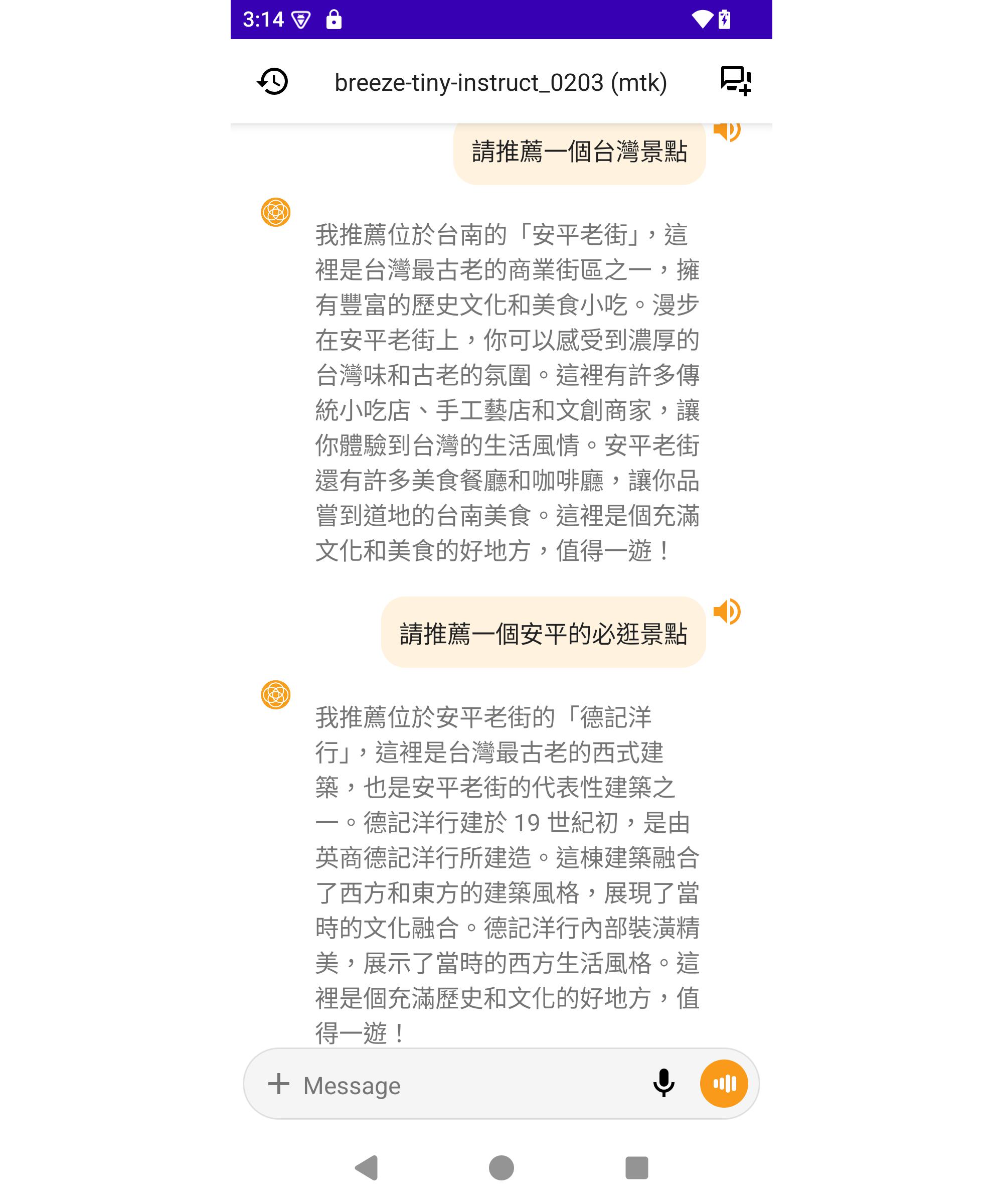 除了開源2款多模態語言模型,聯發創新基地還開源可直接部署到手機、以Llama-Breeze2-3B為基礎的Android App。這個App可作為AI助理,來協助即時翻譯、景點推薦等任務(如下圖),甚至還能生成語音,使用者只要輸入文字,模型就能生成自然的語音回應,可用於智慧導航等情境。