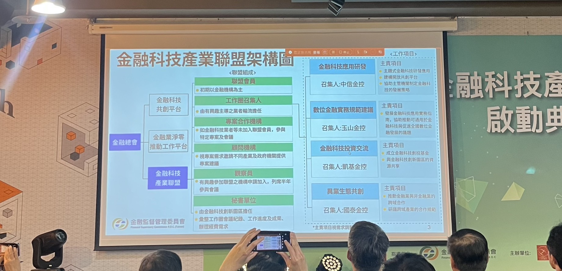 在成立儀式上,金管會創新處長胡則華展示了金融科技產業聯盟架構圖。她表示,產業聯盟的會員初期將以金融機構為主,聯盟核心包含四大工作圈,分別是金融科技應用研發、數位金融實務規範建議、金融科技投資交流及異業生態共創。各組工作圈召集人將由有興趣主導的業者輪流擔任,每任任期為2年。目前,各工作圈首任召集人分別由中信金控、玉山金控、凱基金控及國泰金控擔任。
