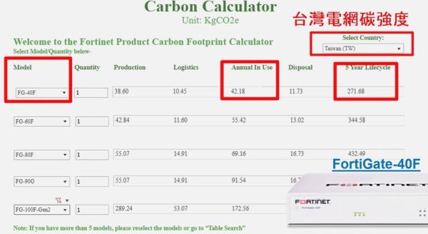 以FortiGate-40F防火牆為例,企業可選擇不同地區部署,來計算產品的碳排,以臺灣地區部署為例,依臺灣電網的碳強度計算,該款防火牆的5年生命周期碳足跡計算約為272公斤的二氧化碳當量,低於某品牌筆電4年的碳足跡計算量。